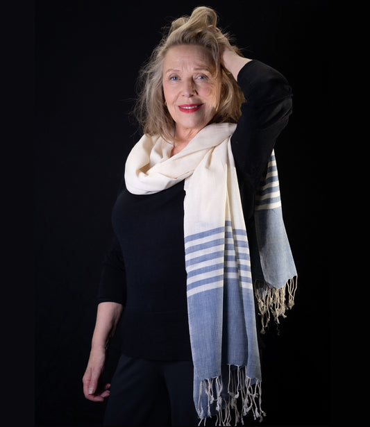 AanbiedingSjaal biokatoen gestreept indigo of grijs