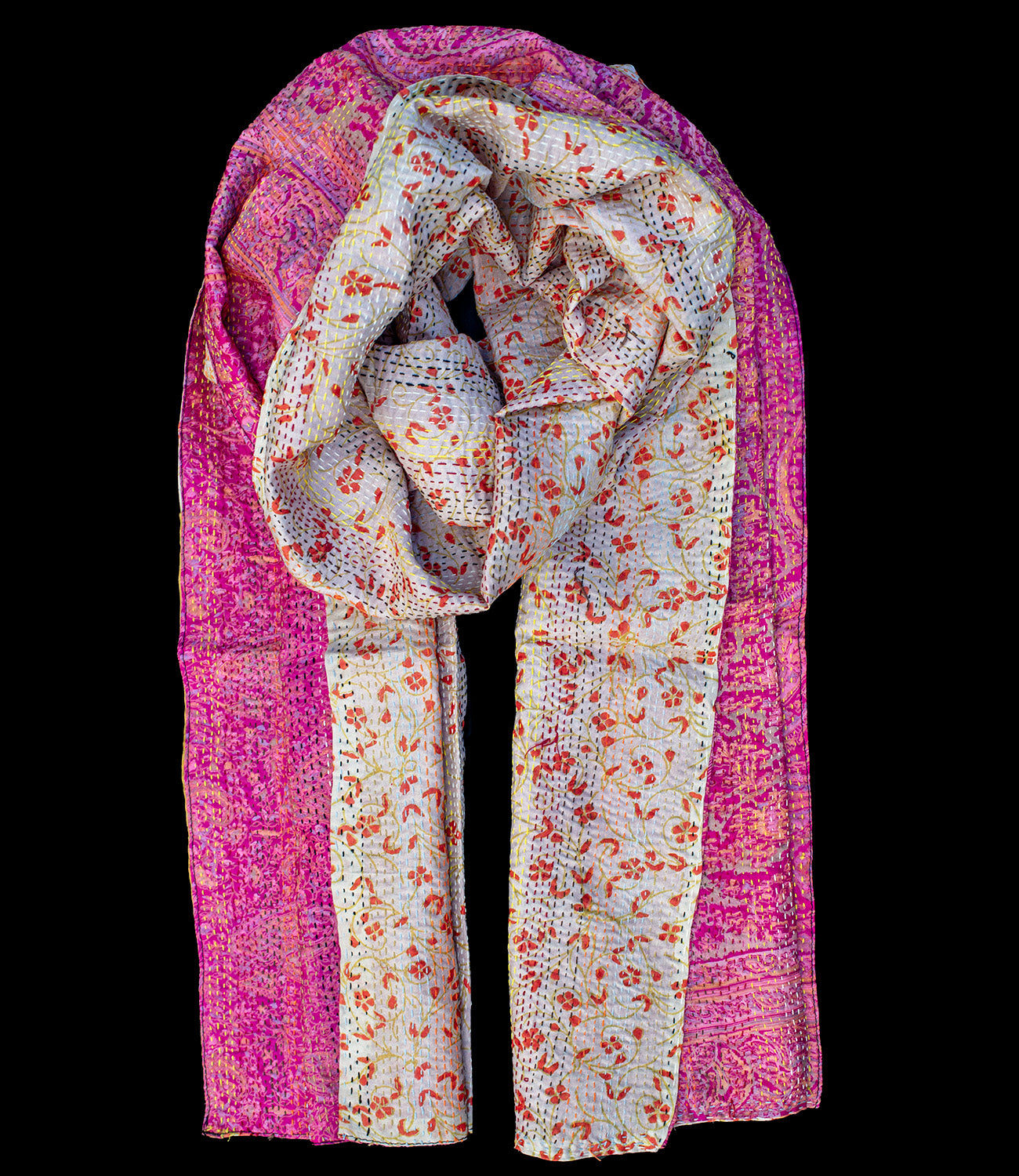 Kleurrijke tweezijdig draagbare sjaal van twee laagjes zijde, handmatig op elkaar geborduurd. De zijden stof is uitgeknipt van gedragen zijden sari's. Een sari is tussen de 5 en 6 m lang en wordt om het lichaam gedrapeerd. Miljoenen vrouwen in India dragen dagelijks een sari.