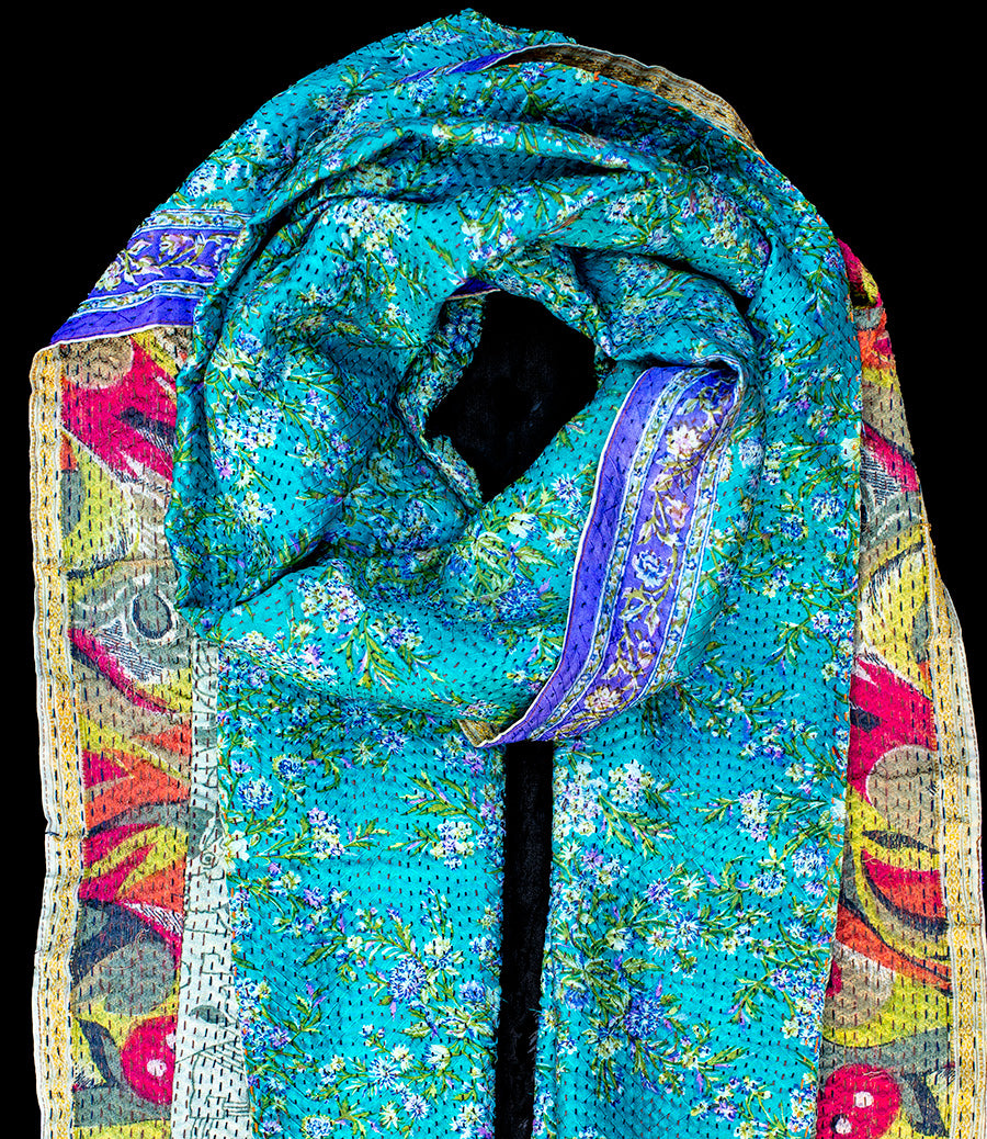 Kleurrijke tweezijdig draagbare sjaal van twee laagjes zijde, handmatig op elkaar geborduurd. De zijden stof is uitgeknipt van gedragen zijden sari's. Een sari is ongeveer 6,6m lang en wordt om het lichaam gedrapeerd. Miljoenen vrouwen in India dragen dagelijks een sari.